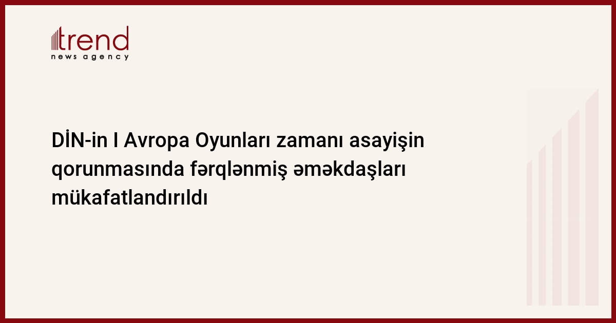 İyulun 14-də Daxili İşlər Nazirliyində (DİN) I Avropa Oyunları zamanı ictimai asayişin qorunmasında qarşıya qoyulan tapşırıqların və təhlükəsizliyin təmin edilməsi üzrə vəzifələrin yerinə yetirilməsində fərqlənmiş bir qrup əməkdaşa mükafatların təqdim olunmasına həsr olunmuş təntənəli mərasim keçirilib.