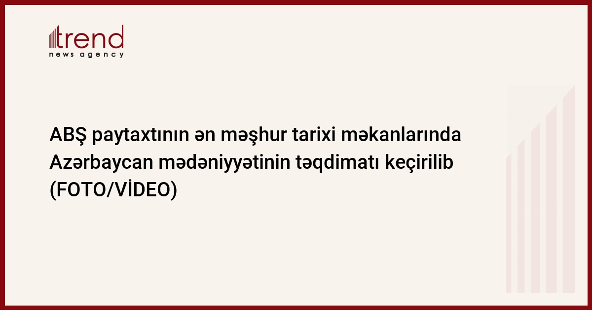 Azərbaycan Respublikasının ABŞ-dakı Səfirliyinin təşkilatçılığı və ABŞ Milli Park Xidmətinin dəstəyi ilə ABŞ paytaxtının ən məşhur tarixi məkanlarında Azərbaycan mədəniyyətinin təqdimatı keçirilib.