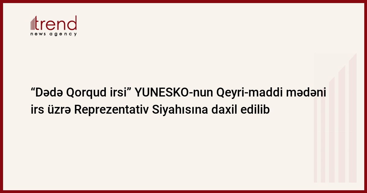 Azərbaycanın Mədəniyyət və Xarici İşlər nazirliklərindən Trend-ə verilən məlumata görə, noyabrın 28-də Mavriki Respublikasının paytaxtı Port Luis şəhərində YUNESKO-nun Qeyri-maddi mədəni irsin qorunması üzrə Hökumətlərarası Komitəsinin 13-cü sessiyasında qəbul edilmiş qərarla Azərbaycanın Türkiyə və Qazaxıstanla birgə təqdim etdiyi “Dədə Qorqud irsi: Dastan mədəniyyəti, xalq nağılları və musiqisi” çoxmillətli mədəniyyət nümunəsi kimi YUNESKO-nun Qeyri-maddi mədəni irs üzrə Reprezentativ Ssiyahısına daxil edilib.