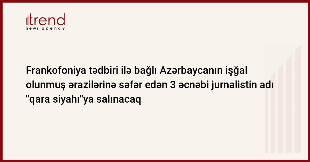 Ermənistanda Frankofoniya tədbiri ilə bağlı Azərbaycanın işğal olunmuş ərazilərinə səfər edən 3 əcnəbi jurnalistin adı arzuolunmaz şəxslər siyahısına daxil ediləcək.