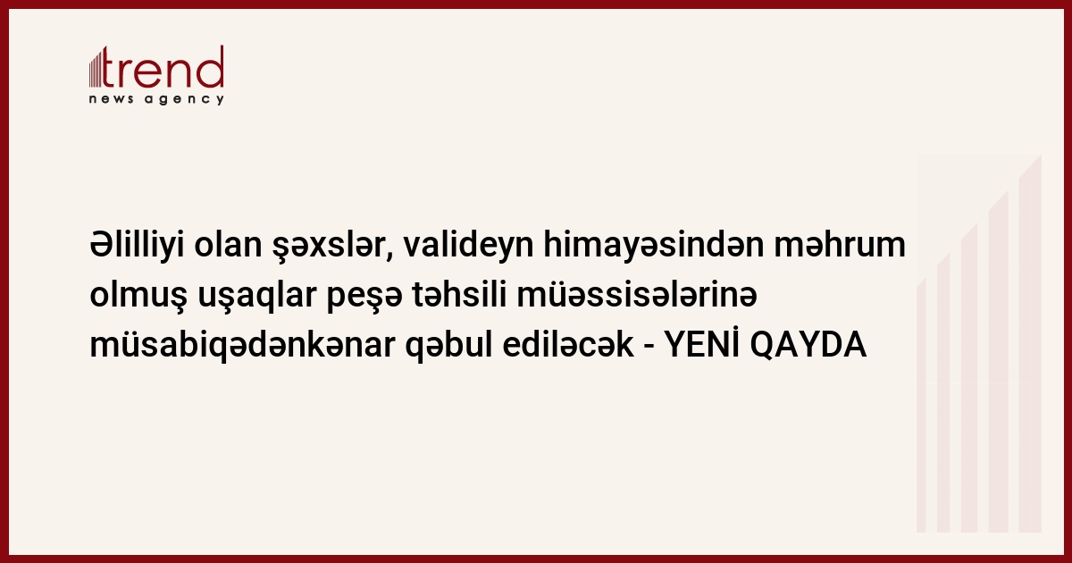 Əlilliyi olan şəxslər, eləcə də valideynlərini itirmiş və valideyn himayəsindən məhrum olmuş uşaqlar peşə təhsili müəssisələrinə müsabiqədənkənar qəbul edilirlər.