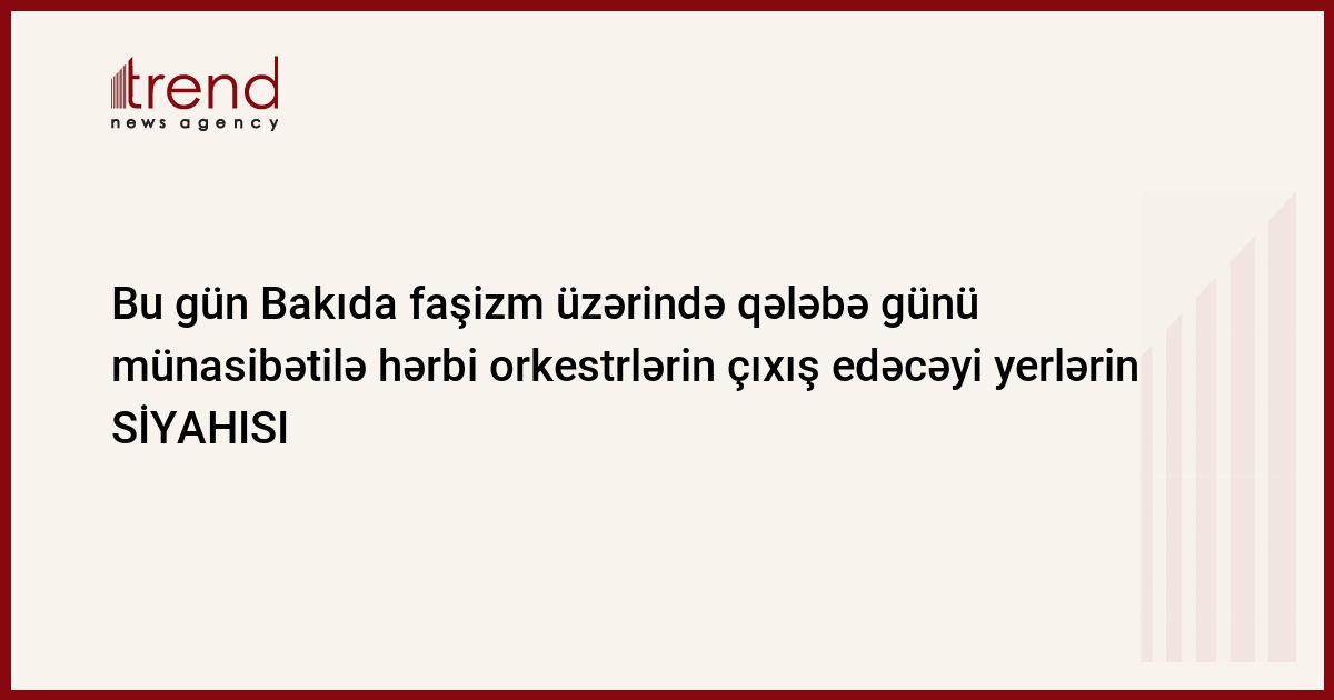 Faşizm üzərində qələbənin 74-cü ildönümü münasibətilə bu gün saat 17:00-dan 19:00-dək Bakı şəhərinin müxtəlif yerlərində hərbi orkestrlərin nümunəvi çıxışları təşkil olunacaq.