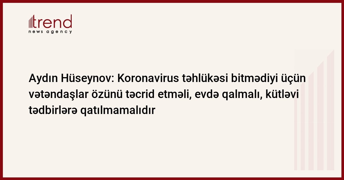 Koronavirus təhlükəsi bitmədiyi üçün vətəndaşlar özünü təcrid etməli, evdə qalmalı, kütləvi tədbirlərə qatılmamalıdır. Məsuliyyətli olmaqla özümüzü və cəmiyyəti qorumalıyıq.
