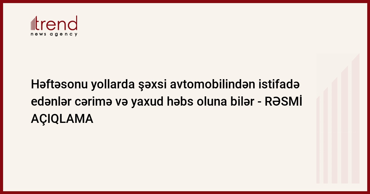 Həftə sonu Bakı, Sumqayıt, Gəncə, Lənkəran şəhərləri və Abşeron rayonu ərazisində xüsusi karantin rejiminin sərtləşdirilməsi zamanı avtmobil yollarında karantin postları quraşdırılmayacaq.