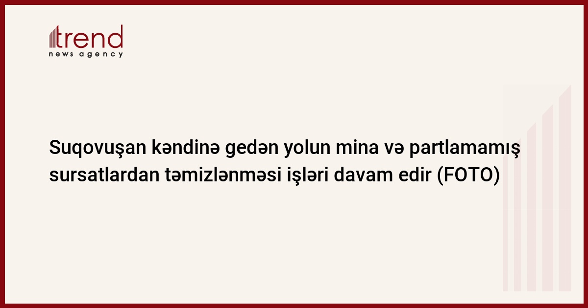 Tərtər rayonunun Suqovuşan kəndinə gedən avtomobil yolunun yenidən qurulması üçün ərazilərin minaladan və partlamamış hərbi sursatlardan təmizlənməsi işləri davam edir.
