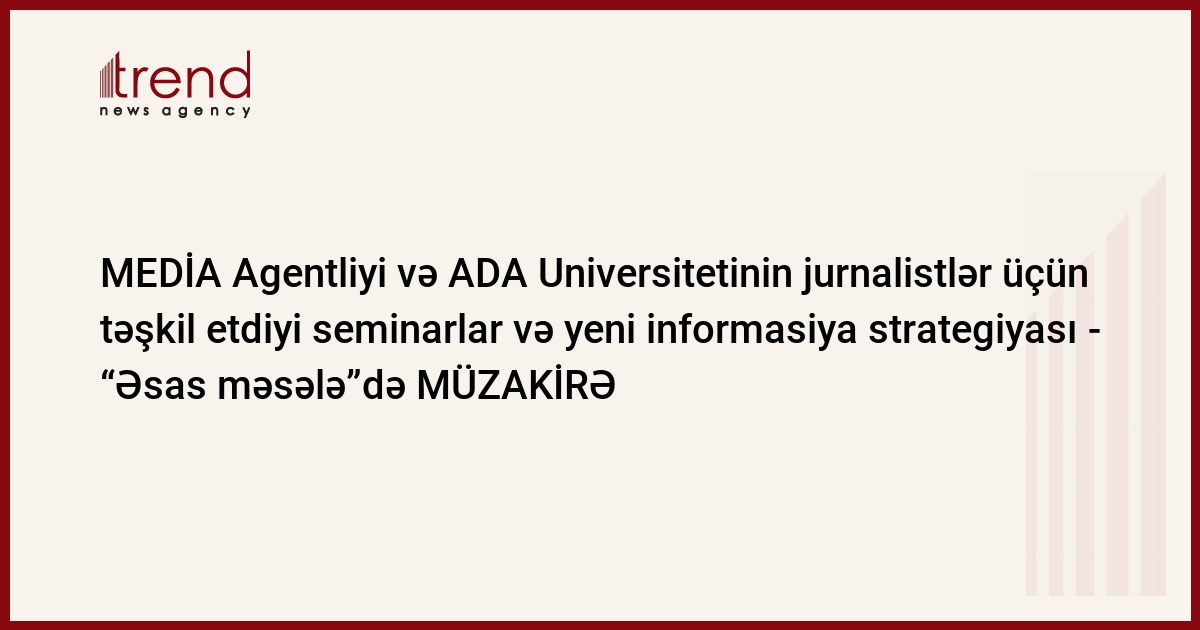 Trend-in məlumatına görə, Ətayə Ələmdarqızının təqdimatında AzTV-nin “Əsas məsələ” verilişində “MEDİA Agentliyi və ADA Universitetinin jurnalistlər üçün təşkil etdiyi seminarlar və yeni informasiya strategiyası” mövzusunda aparılan müzakirələr zamanı bu barədə ətraflı danışılıb. Verilişin qonaqları – MEDİA Agentliyinin şöbə müdiri Natiq Məmmədli, ADA Universitetinin media və kommunikasiya üzrə müəllimi Şəfəq Mehraliyeva, “Əl-Cəzirə” televiziya kanalının əməkdaşi Rəsul Sərdar Ataş və “525-ci qəzet”in Baş redaktoru Rəşad Məcid mövzu ətrafında müzakirə aparıblar.