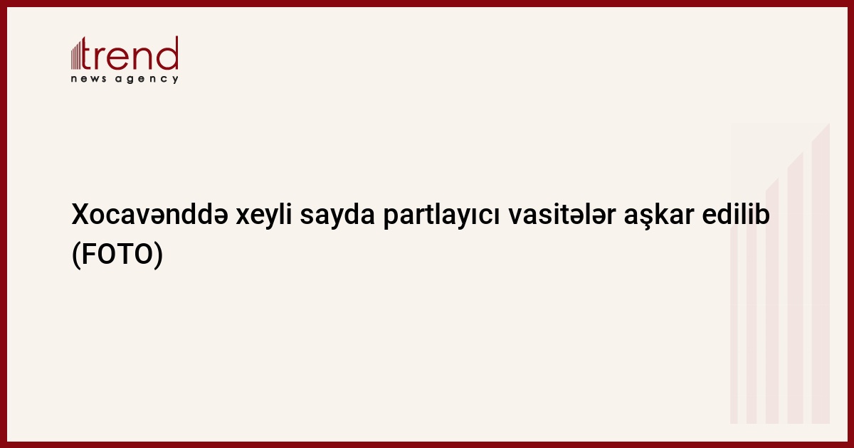 Daxili İşlər Nazirliyinin Mətbuat Xidmətinin Bərdə regional qrupundan Trend-ə verilən məlumata görə, Xocavənd Rayon Polis Şöbəsinin əməkdaşları tərəfindən keçirilmiş tədbirlər nəticəsində erməni hərbi birləşmələrinin tərk etdiyi mövqelərdən xeyli sayda partlayıcı vasitələr aşkar edilib.