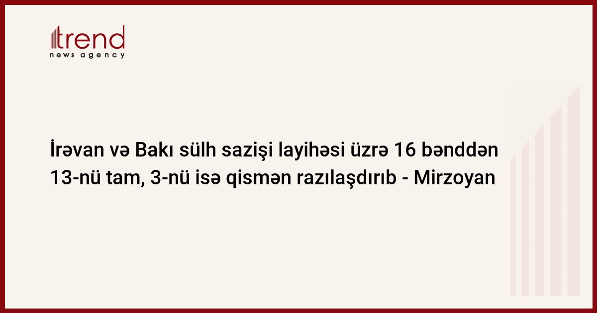 XİN rəhbəri vurğulayıb ki, İrəvan və Bakı sülh sazişi layihəsi üzrə 16 bənddən 13-nü tam, 3-nü isə qismən razılaşdırıblar.