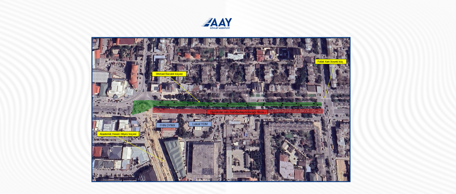 Həsən Əliyev küçəsindən Ziya Bünyadov prospektinə paralel olaraq “Koroğlu” metro stansiyasına qədər yeni avtomobil yolunun tikintisi və istismara verilməsi işləri ilə əlaqədar 27 dekabr saat 00:00-dan etibarən Əhməd Rəcəbli küçəsindən Fətəli Xan Xoyski küçəsinə qədər olan hissədə nəqliyyat vasitələrinin hərəkəti məhdudlaşdırılacaq.