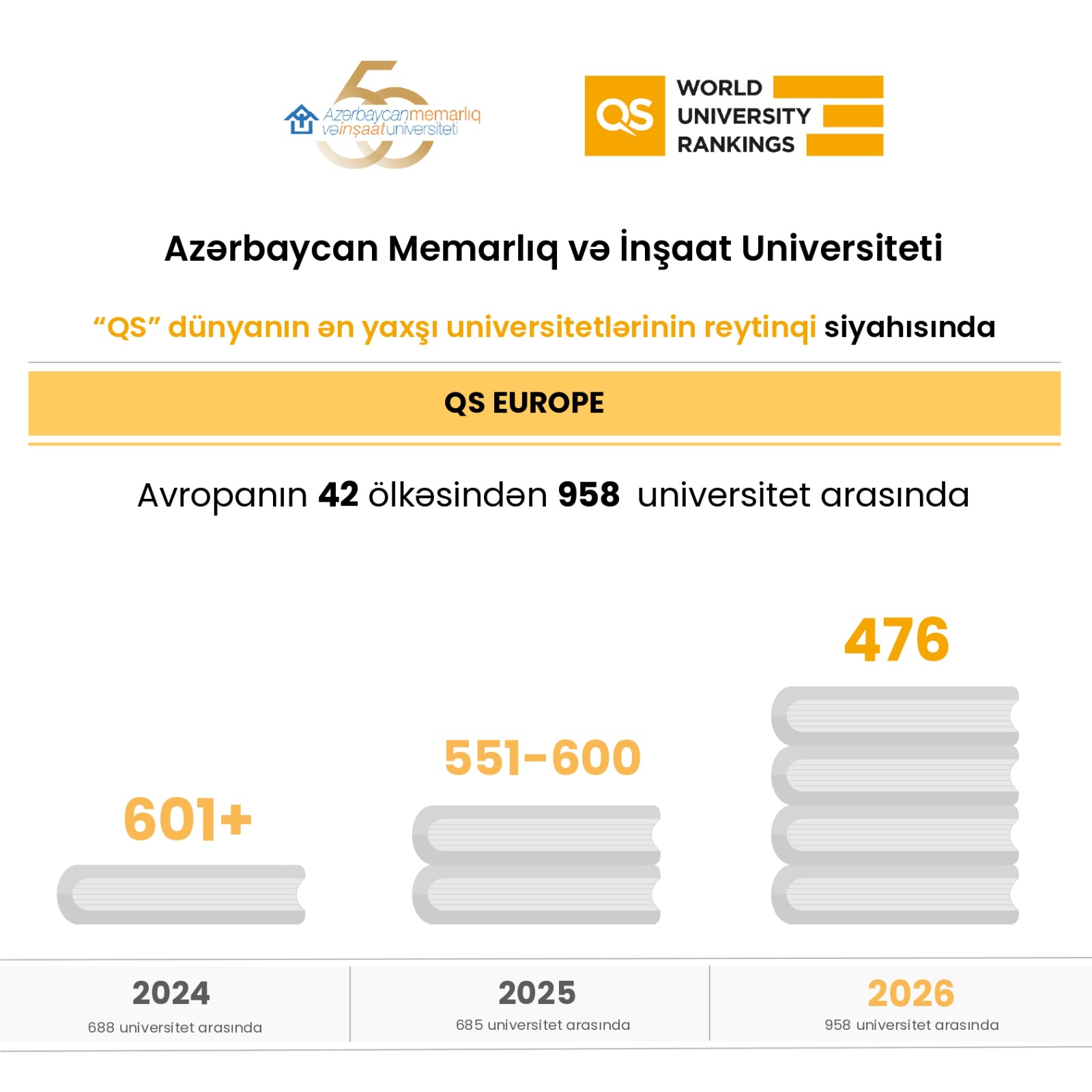Cari reytinq siyahısına Avropanın 42 ölkəsindən ümumilikdə 958 ali təhsil müəssisəsi daxil edilib. AzMİU 2026-cı il üzrə Avropa reytinqində 476-cı mövqedə qərarlaşıb. Qeyd etmək lazımdır ki, universitet 2024-cü ildə 601+, 2025-ci ildə isə 551–600 aralığında yer almışdı. Qısa müddət ərzində əldə olunan bu yüksəliş AzMİU-nun beynəlxalq reytinqlər üzrə ardıcıl, davamlı və strateji inkişaf trayektoriyası üzrə irəlilədiyini aydın şəkildə nümayiş etdirir.