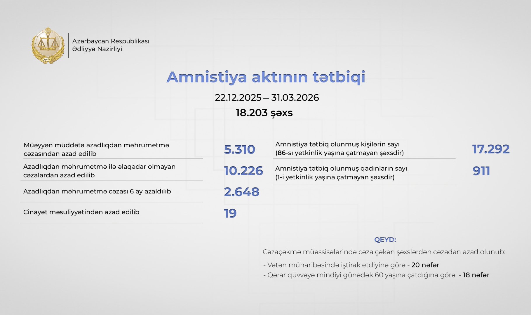 22 dekabr 2025-ci ildən 31 mart 2026-cı ilədək prokurorluq və məhkəmə orqanları ilə birgə Ədliyyə Nazirliyinin Penitensiar və Probasiya xidmətləri, habelə İstintaq idarəsi üzrə 18 203 nəfər barəsində amnistiya qərarı tətbiq olunub.