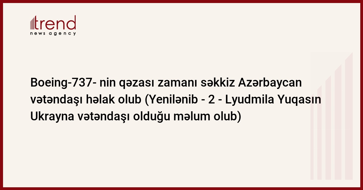 Rusiya, Moskva, 14 sentyabr / Trend , müxbir R. Ağayev/ "Aeroflot"un mətbuat xidmətindən öncə verilən məlumata görə, Moskva - Perm reysi üzrə uçan və qəzaya uğrayan Boeing-737 - 500 təyyarəsində həlak olan 08-12-1957-ci il təvəllüdlü Lyudmila Yuqasın azərbaycanlı deyil, Ukrayna vətəndaşı olduğu meydana çıxıb. Bu barədə Trend - a Azərbaycanın Rusiya Federasiyasındakı səfirliyinin konsulluq şöbəsinin, hazırda bilavasitə "Şeremetyeva-1" aeroportundakı Böhran Qərərgahında işləyən nümayəndəsi bildirib.