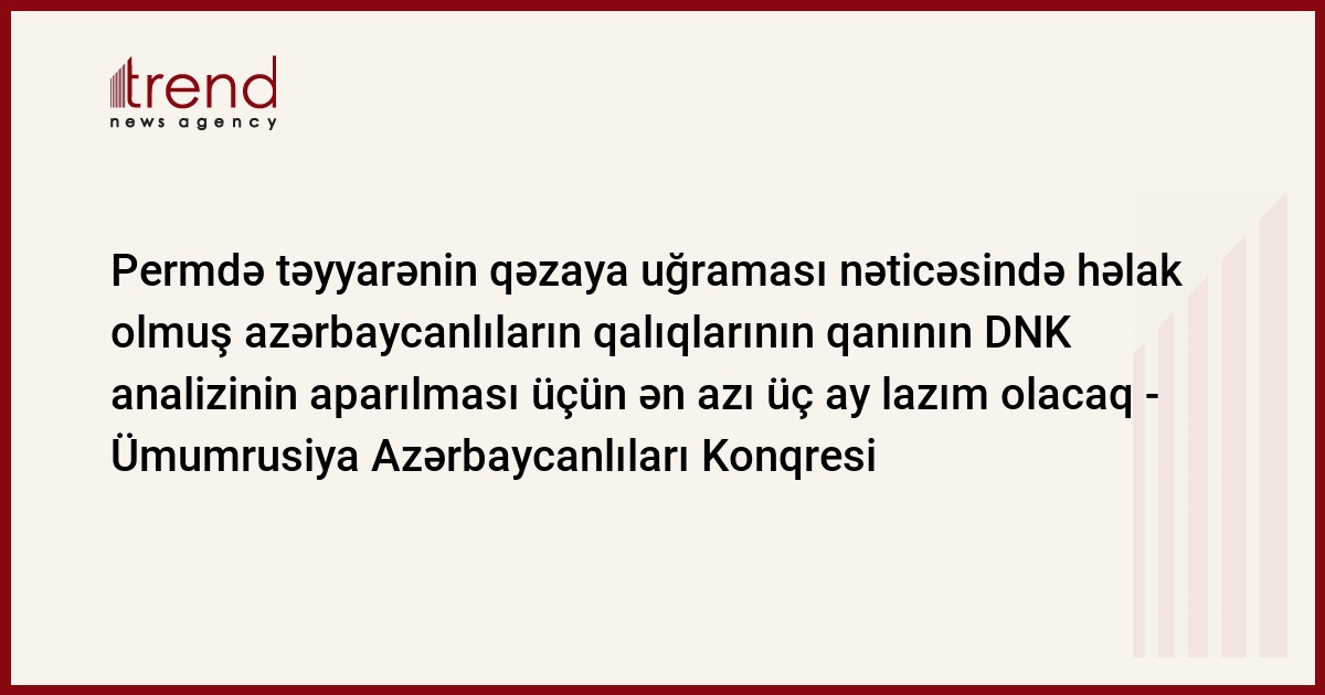 Azərbaycan, Bakı, 02 oktyabr/ Trend , müxbir R.Novruzov/ Permdə təyyarənin qəzaya uğraması nəticəsində həlak olmuş azərbaycanlıların qalıqlarının qanının DNK analizinin aparılması ən azı üç aydan sonra başa çatacaq, - cümə axşamı Trend - a telefonla Ümumrusiya Azərbaycanlıları Konqresi təşkilatının Perm vilayəti üzrə regional nümayəndəliyindən deyiblər.