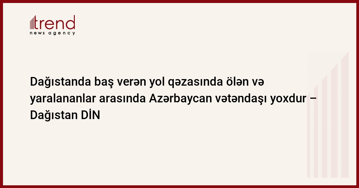 Dağıstanda baş vermiş yol qəzasında ölən və yaralananlar arasında Azərbaycan vətəndaşı yoxdur. Bu barədə Dağıstan Muxtar Respublikası Daxili İşlər Nazirliyinin (DİN) növbətçi hissəsi Trend -a bildirib.