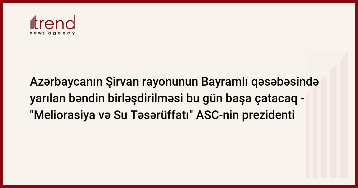Trend-in hadisə yerində olan əməkdaşının məlumatına görə, "Meliorasiya və Su Təsərüffatı" ASC-nin prezidenti Əhməd Əhmədzadə çərşənbə günü jurnalistlərə bildirib ki, Şirvan rayonunun Bayramlı qəsəbəsində yarılan bəndin birləşdirilməsi bu gün başa çatacaq. O bildirib ki, bir neçə günə bəndin möhkəmləndirilməsi işləri aparılacaq ki, suyun süzülməsinin qarşısı alınsın.