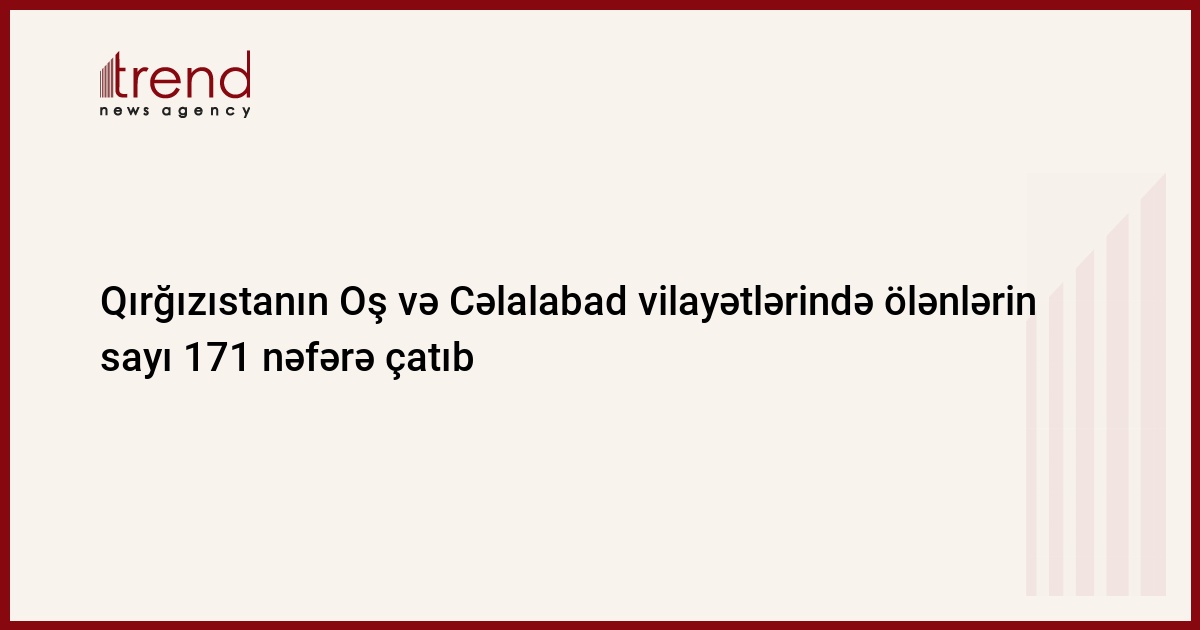 Qırğızıstan Səhiyyə Nazirliyinin mətbuat mərkəzinin dəqiqləşdirilmiş məlumatına əsasən, iyunun 15-i saat 07:00-a olan vəziyyətə görə, həlak olanların sayı 171 nəfərə çatıb. Oş vilayətində ölənlərin sayı 128, Cəlalabad vilayətində isə 43 nəfər təşkil edir. Məlumatı CA-NEWS yayıb.
