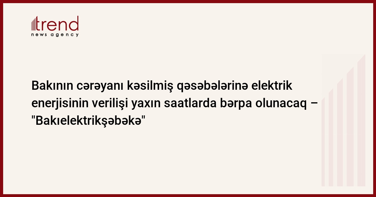 Yaxın saatlarda Bakının elektik cərəyanının kəsildiyi hissələrinə və ətraf ərazilərinə elektrik enerjisinin verilişi bərpa olunacaq. Bu barədə şənbə günü "Bakıelektrikşəbəkə" SC-nin mətbuat xidmətinin rəhbəri Tanrıverdi Mustafayev bildirib.
