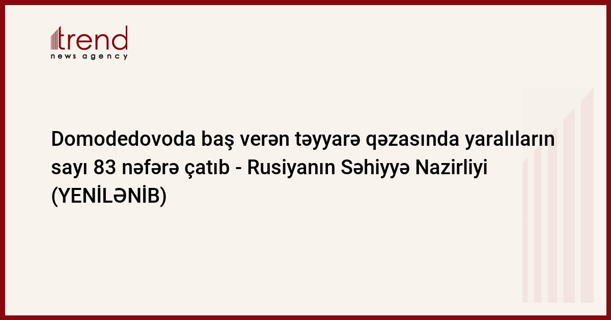 Moskvanın Domodedovo hava limanında baş verən təyyarə qəzası nəticəsində xəsarət alanların sayı 83 nəfərə çatıb. Bu barədə RİA Novosti xəbər agentliyi Rusiyanın Səhiyyə Nazirliyinə istinadən məlumat verib.