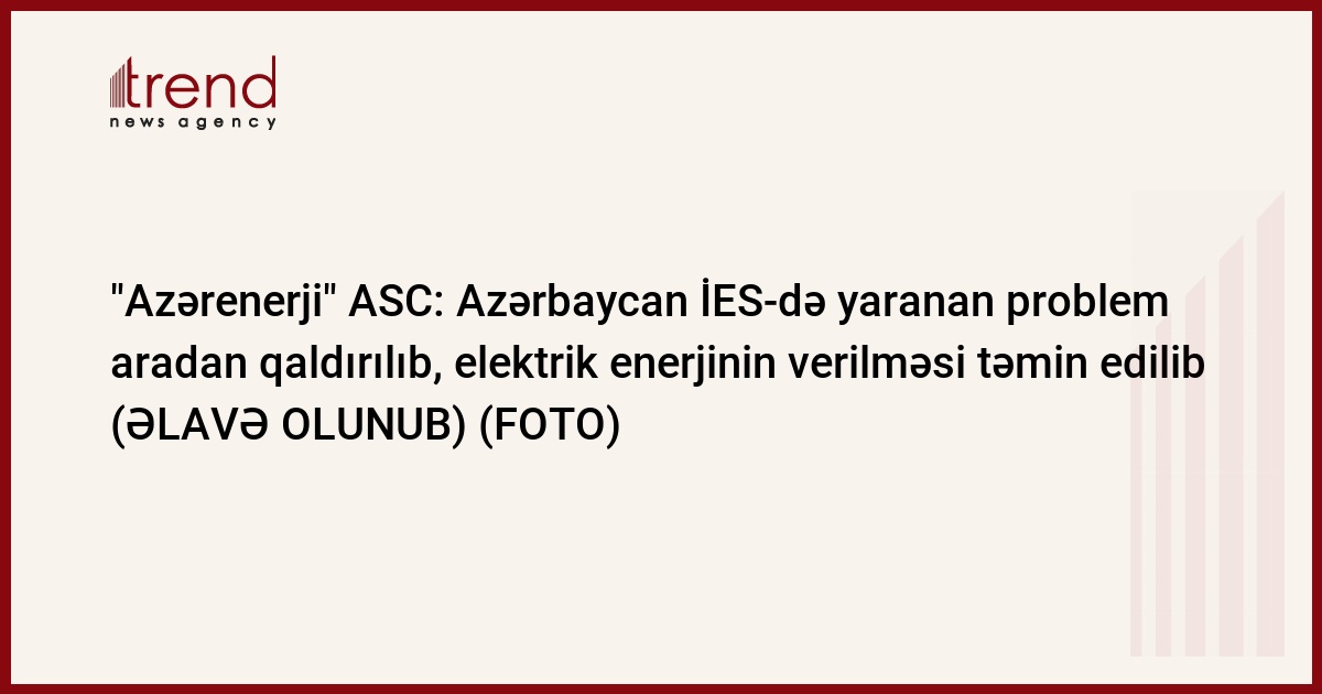 "Azərenerji" ASC-dən Trend-ə bildirib lər ki, Azərbaycan İES-də yaranan problem aradan qaldırılıb və elektrik enerjinin verilməsi tam təmin edilib.