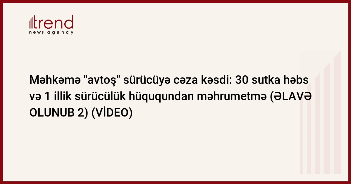 Nizami rayon məhkəməsinin bu gün keçirilən iclasında "avtoş" sürücü barəsində qərar qəbul edilib. Belə ki, məhkəmə T.İbrahimovu bir il müddətinə sürücülük hüququndan məhrum etməklə 30 sutka həbslə cəzalandırıb.