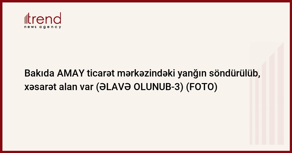 Bakı şəhər Təcili və Təxirəsalınmaz Tibbi Yardım Stansiyasından (BŞTTTYS) Trend-ə bildiriblər ki, AMAY ticarət mərkəzində yanğın baş verməsi ilə bağlı çağırış olub: "Hazırda bir təcili yardım briqadası hadisə yerindədir. Hələlik yanğın hadisəsi zamanı xəsarətlə bağlı müraciət edən olmayıb".