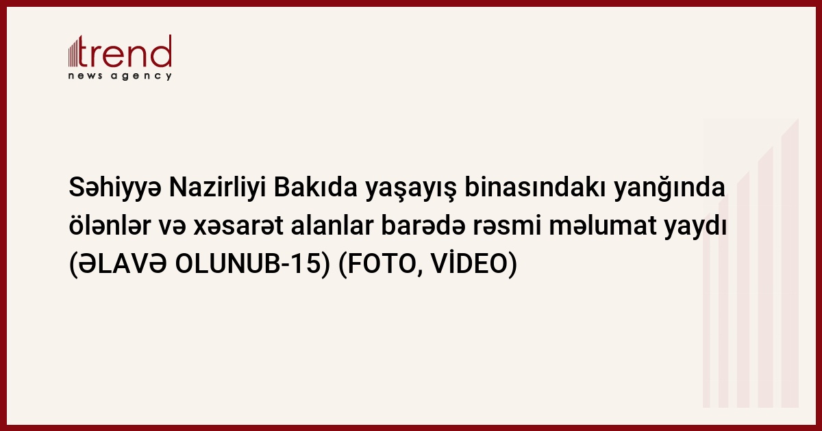 Trend Səhiyyə Nazirliyinin saytına istinadən rəsmi məlumatı təqdim edir: "Bakı şəhəri, Binəqədi rayonu, Azadlıq prospekti, 170 ünvanındakı yaşayış binasında baş vermiş yanğınla əlaqədar xəstəxanalarda yerləşdirilən yaralıların həyati təhlükəsi yoxdur.