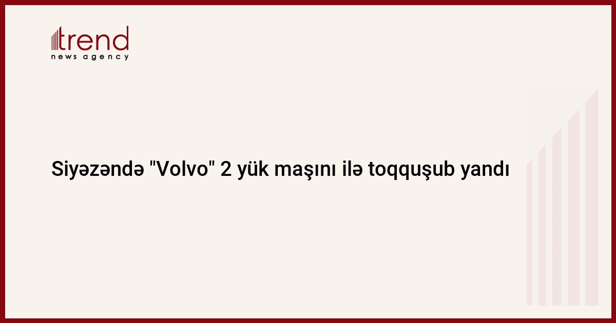 Siyəzəndə yol-nəqliyyat hadisəsi baş verib. Trend-ə Fövqəladə Hallar Nazirliyindən verilən məlumata görə, Böhran Vəziyyətlərində İdarəetmə Mərkəzinə daxil olmuş məlumata əsasən, rayonun Zarat kəndində "Volvo" və "Mercedes" markalı iki yük avtomobili toqquşub. Nəticədə yanğın baş verib.