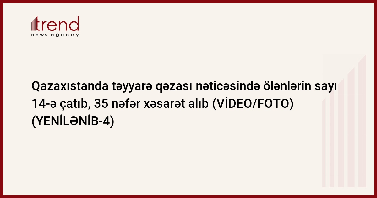 Qazaxıstanda "Bek Air" aviaşirkətinə məxsus sərnişin təyyarəsinin qəzaya uğraması nəticəsində həlak olanların sayı 14 nəfərə çatıb.