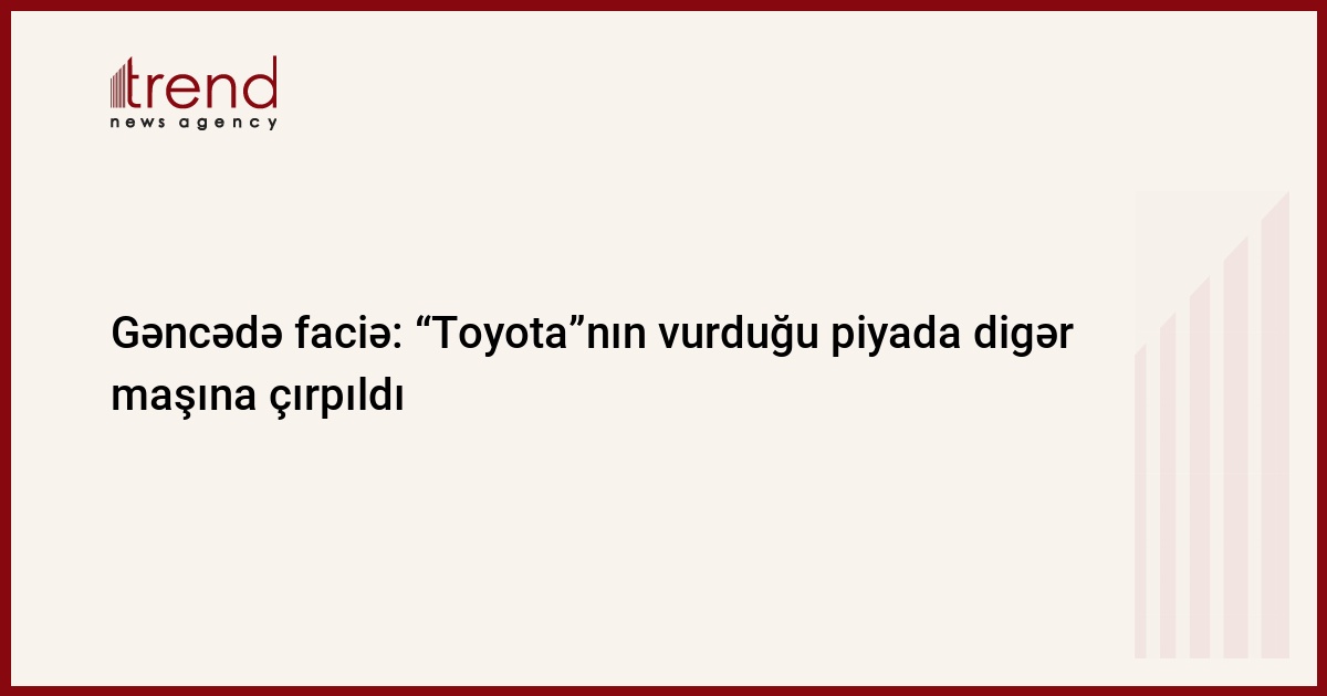 Daxili İşlər Nazirliyinin Mətbuat xidmətindən Trend-ə verilən məlumata görə, fevralın 5-də saat 23 radələrində Gəncə şəhərində şəhər sakini M.Qəhrəmanov idarə etdiyi “Toyota” markalı avtomobillə yolu keçən həmyerlisi Elminaz Məmmədovanı vurub eyni istiqamətdə hərəkətdə olan Gəncə şəhər sakini N.Qocayevin idarə etdiyi “Volkswagen” markalı avtomobilin üzərinə atıb. Nəticədə piyada aldığı xəsarətlərdən hadisə yerində ölüb.