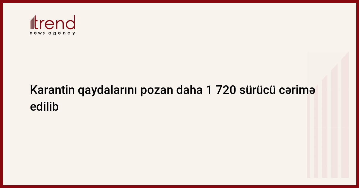 Koronavirus (COVİD-19) infeksiyasının yayılmasının qarşısının alınması məqsədilə tətbiq edilən xüsusi karantin rejiminin pozulmasına görə 15.05.2020-ci il saat 00:00-dan 18.05.2020-ci il 00:00-dək olan müddət ərzində respublikanın avtomobil yollarında nəqliyyat vasitələri ilə hərəkətdə olan 1 720 nəfər Azərbaycan Respublikası İnzibati Xətalar Məcəlləsinin 211-ci maddəsi ilə inzibati məsuliyyətə cəlb edilib.
