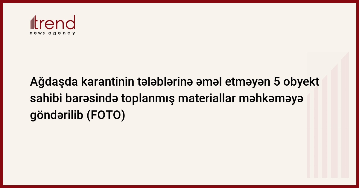 Ümumilikdə şəhər ərazisində qaydaları pozduqları üçün 5 obyekt sahibi və icarədar, eləcə də polisin qanuni tələbinə məhəl qoymayan 1 nəfər barəsində Ağdaş Rayon Polis Şöbəsində toplanmış materiallar hüquqi qiymət verilməsi üçün rayon məhkəməsinə göndərilib.