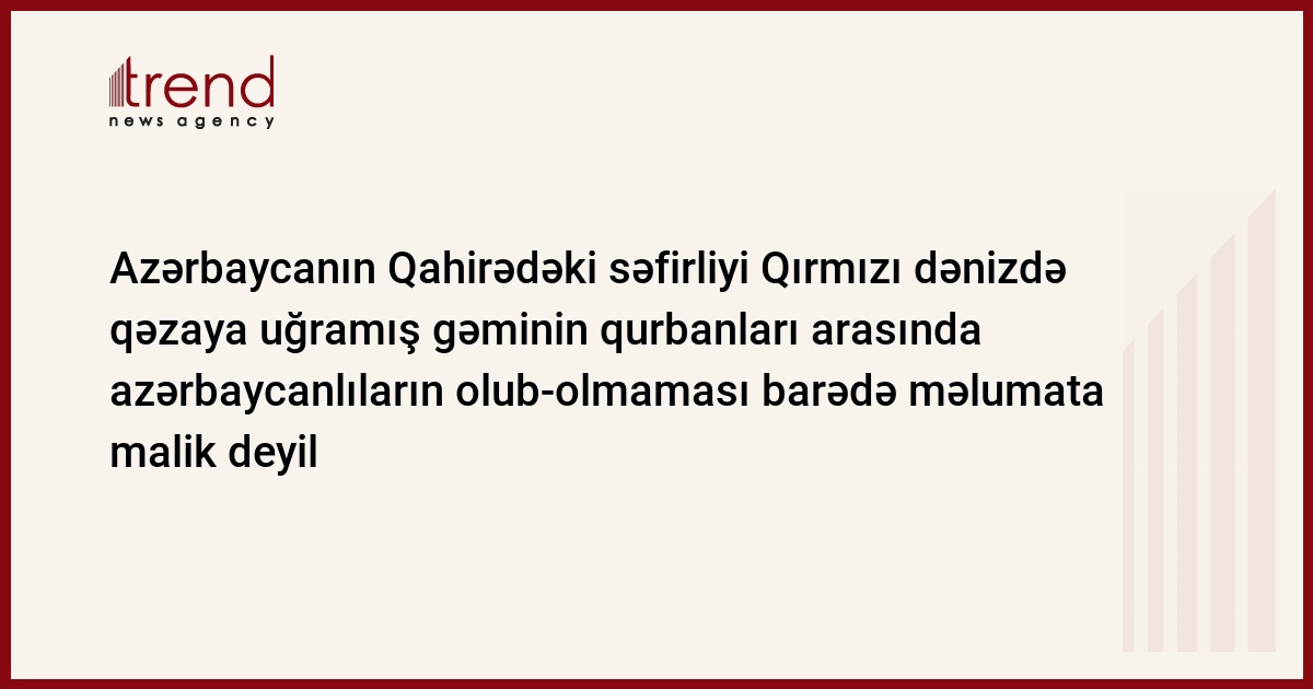 Azərbaycanın Qahirədəki səfirliyi Qırmızı dənizdə qəzaya uğramış gəminin qurbanları arasında azərbaycanlıların olub-olmaması barədə məlumata malik deyil. Bu barədə Trend ə Azərbaycanın Qahirədəki səfirliyindən məlumat verilib.