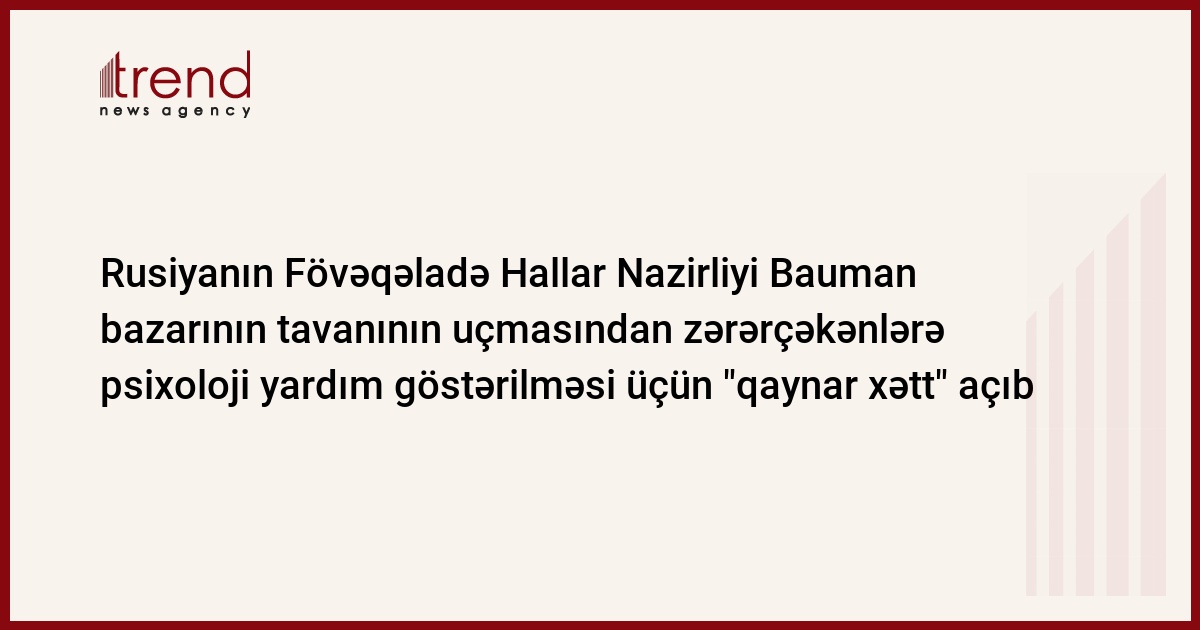 RF-nın FHN-də Bauman bazarının tavanının uçmasından zərər çəkənlərə psixoloji yardım göstərilməsi üçün "qaynar xətt" açılıb. Nazirliyin informasiya və ictimaiyyətlə əlaqələr idarəsinin rəisinin müavini Viktor Belsovun RBK agentliyinə verdiyi məlumata görə, adamlar 626-37-07 nömrəli telefon vasitəsilə FHN-nin psixoloqlarından yardım ala bilərlər.