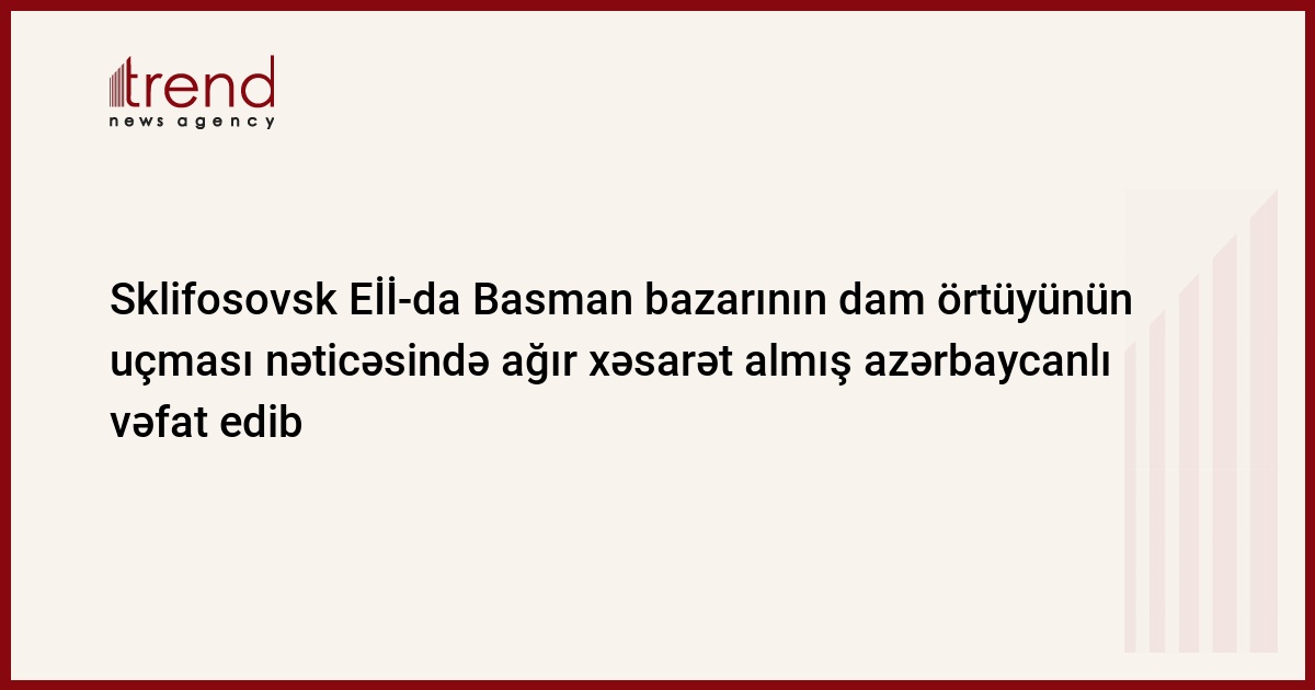 Moskvanın Sklifosovsk Eİİ-da Basman bazarının dam örtüyünün uçması nəticəsində ağır xəsarət almış azərbaycanlı vəfat edib. Bu barədə Trend ə Sklifosovsk Eİİ-dan məlumat verilib.