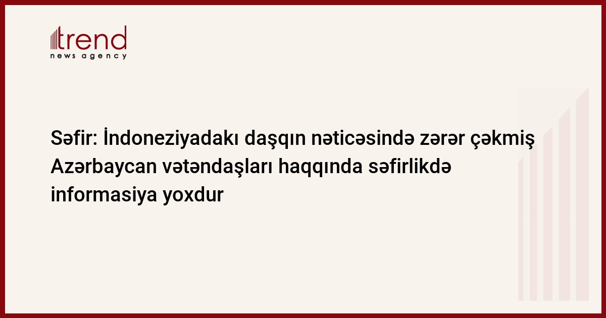 İndoneziyadakı daşqın nəticəsində zərər çəkmiş Azərbaycan vətəndaşları haqqında səfirlikdə informasiya yoxdur. Bu barədə eksklüziv olaraq Azərbaycanın İndoneziyadakı səfiri İbrahim Hacıyev bildirib.