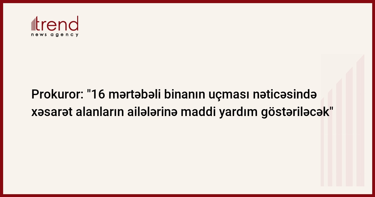 Azərbaycan, Bakı/ Trend , müxbir K.Zərbalıyeva/ Bakıda baş vermiş bina uçqunu zamanı 6 nəfər həlak olub, 4 nəfər xəsarət alıb. Bakı şəhər prokuroru Əziz Seyidov bildirib ki, ölənlərdən 5-nin şəxsiyyəti müəyyən edilib, birinin isə şəxsiyyətini müəyyənləşdirmək hələlik mümkün olmayıb. Hadisə nəticəsində həlak olan 5 nəfərin cəsədi artıq yaşadıqları rayonlara göndərilib. Onların 3-ü Astara rayonunun Ərçivan kəndinin, 1-i Qax rayonunun, 1-i isə Gəncə şəhərinin sakini olub. Bakı şəhər prokuroru bildirib ki, yerli icra orqanlarına həlak olanlarının dəfninin təşkili və ailələrinə maddi yardım göstərilməsi üçün tapşırıqlar verilib.