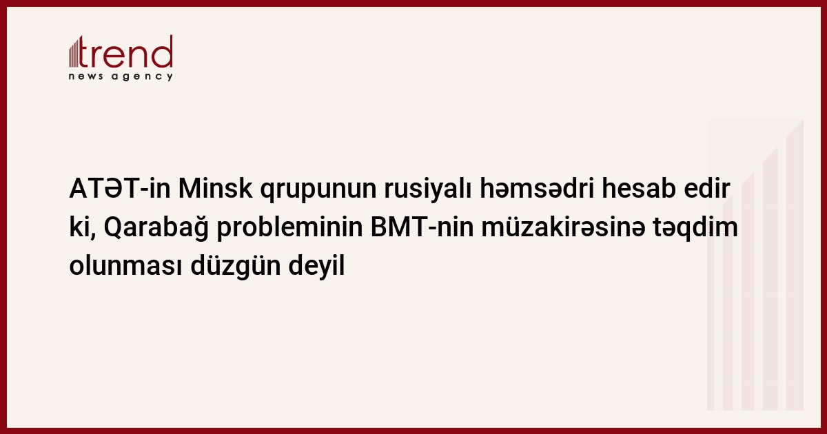 ATƏT-in Minsk qrupu həmsədrləri hesab edir ki, Qarabağ probleminin BMT-nin müzakirəsinə təqdim olunması düzgün deyil. Bu barədə bazar ertəsi İrəvanda mətbuat konfransında ATƏT-in Minsk qrupunun rusiyalı həmsədri Yuri Merzlyakov bəyan edib, "Novosti-Armeniya"nın verdiyi məlumatda belə deyilir. "Qarabağ münaqişəsinin həlli məsələsini BMT-nin müzakirəsinə çıxarmaq barədə danışmaq olmaz. Bu nə hüquqi, nə siyasi, nə də ki, diplomatik baxımdan düzgündür" - deyə o bildirib. Onun sözlərinə görə, məsələnin BMT formatında müzakirəsi münaqişə tərəflərinin qarşılıqlı surətədə qəbul etdiyi qərardan sonra mümkün ola bilər.
