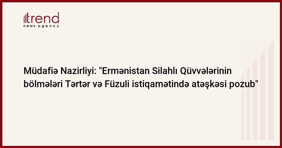 Azərbaycan, Bakı / Trend müxbir K.Zərbalıyeva/ Ermənistan Silahlı Qüvvələrinin bölmələri Tərtər və Füzuli rayonları istiqamətində atəşkəsi pozub. Müdafiə Nazirliyinin mətbuat xidmətinin çərşənbə günü yaydığı məlumatda bildirilir ki, Ermənistan Silahlı Qüvvələri sentyabrın 25-də gün ərzində fasilələrlə Xocavənd rayonu ərazisindəki adsız yüksəkliklərdə və Kuropatkino kəndində yerləşən mövqelərdən, saat 17.35-dən 18.00-dək Tərtər rayonunun Çiləbürt kəndinin yaxınlığında yerləşən mövqelərdən, sentyabrın 26-da saat 01.20-dən 01.30-dək Füzuli rayonunun Qərvənd kəndinin yaxınlığında yerləşən mövqelərdən Azərbaycan Silahlı Qüvvələrinin üzbəüz mövqelərini avtomat və pulemyotlardan atəşə tutub.