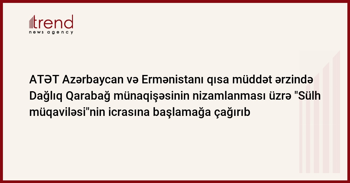 Azərbaycan, Bakı / Trend müxbir K.Ramazanova/ Dağlıq Qarabağ münaqişəsinin nizamlanması üzrə ATƏT-in Minsk qrupunun həmsədrləri Azərbaycan və Ermənistanı qısa müddət ərzində "Sülh müqaviləsi"nin icrasına başlamağa çağırıb.
