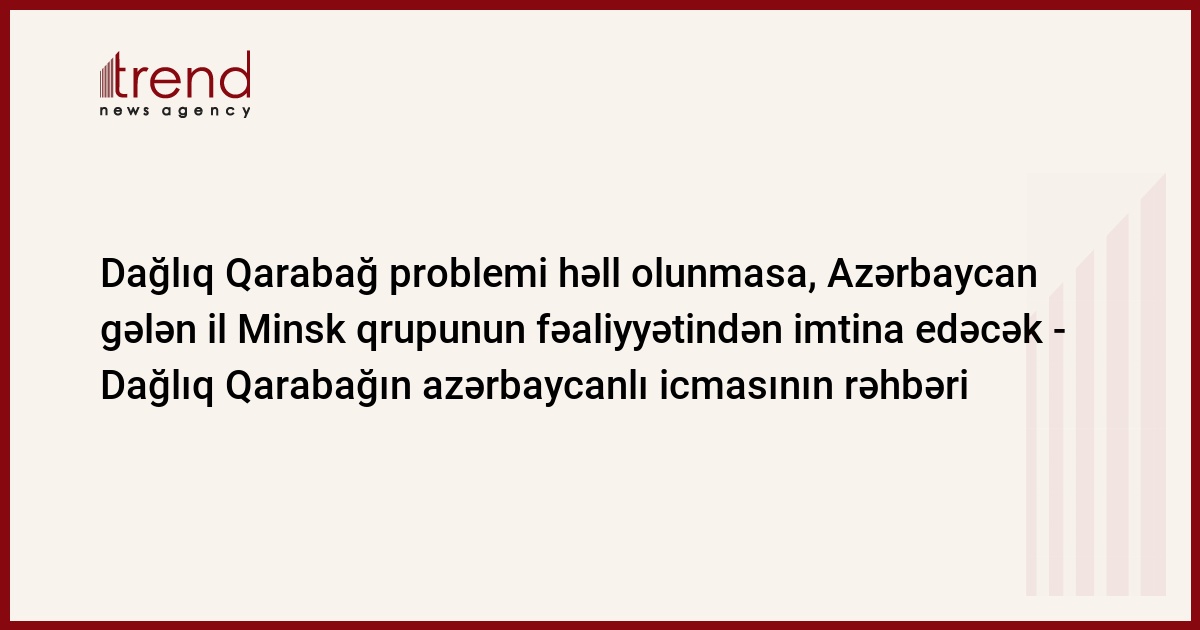 Azərbaycan, Bakı / Trend müxbir E.Hüseynli/ Azərbaycanın ictimai-siyasi təşkilatları Dağlıq Qarabağ probleminin həllində vasitəçilik edən ATƏT-in Minsk qrupunun fəaliyyətindən narazıdırlar. "Minsk qrupu gələn ilin əvvəlindən Dağlıq Qarabağ probleminin həlli istiqamətində Azərbaycanın mövqeyinə uyğun və beynəlxalq hüquq normaları çərçivəsində təkliflər zərfi təqdim etməsə, çox güman ki, rəsmi Bakı həmsədrlərin fəliyyətindən imtina edəcək" cümə axşamı Trend ə açıqlamasında Dağlıq Qarabağın azərbaycanlı icmasının rəhbəri Nizami Bəhmənov bildirib.
