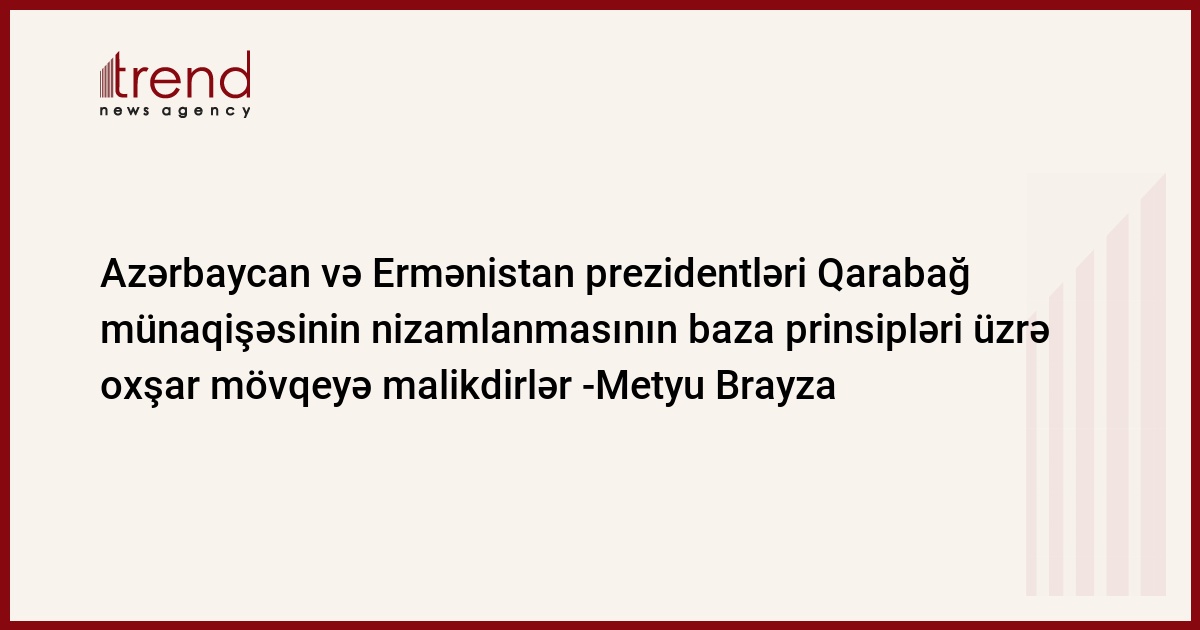 Azərbaycan və Ermənistan prezidentləri İlham Əliyev və Robert Köçəryan Qarabağ münaqişəsinin nizamlanmasının baza prinsipləri üzrə oxşar mövqeyə malikdirlər. Bu barədə cümə axşamı ATƏT-in Minsk Qrupunun amerikalı həmsədri Metyu Brayza İrəvanda jurnalistlərə bildirib. Bu barədə Novosti-Armeniya xəbər verib.