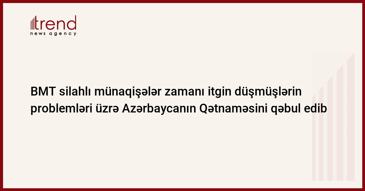 Azərbaycan, Bakı, 29 mart / Trend , müxbir S.Ağayeva/ BMT silahlı münaqişələr zamanı itgin düşmüş şəxslərin problemlərinə həsr olunmuş Azərbaycanın Qətnaməsini qəbul edib. Azərbaycan nümayəndə heyəti tərəfindən irəli sürülən Qətnamə layihəsi Cenevrədə BMT-nin İnsan Haqları Şurasının yeddinci iclasında qəbul olunub. Bu barədə şənbə günü BMT-nin Cenevrədəki şöbəsində Azərbaycanın daimi nümayəndəsi, səfir Elçin Əmirbəyov məlumat verib.