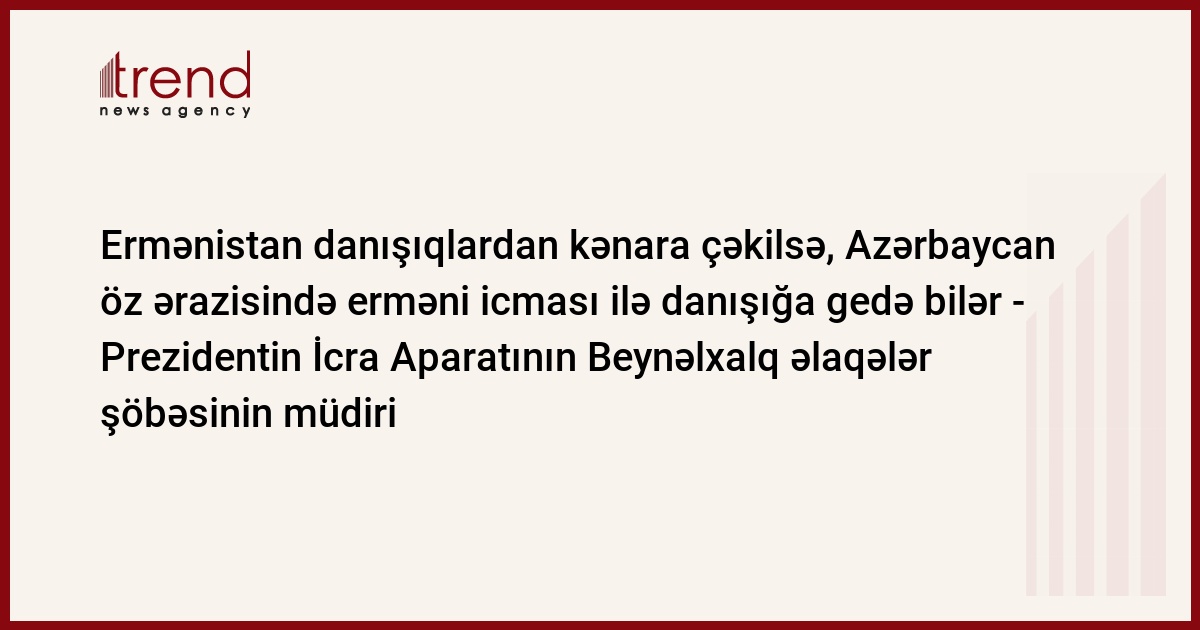 Azərbaycan, Bakı, 14 iyun/ Trend , müxbir E.Babayev/ Rəsmi Bakı Dağlıq Qarabağın erməni icmasının danışıqlar prosesinə cəlb olunması üçün Ermənistanın prosesdən kənara çəkilməsini istəyir. "Ermənistan bu prosesdən tam kənara çəkilməlidir. Azərbaycanın torpaqlarını Ermənistan Silahlı Qüvvələri işğal ediblər. Ermənistan tamamilə kənara çəkilərsə, Azərbaycanın daxili işlərinə qarışmamaq şərti ilə Azərbaycan öz ərazisində erməni icması ilə danışığa gedə bilər", şənbə günü Prezidentin İcra Aparatının Beynəlxalq əlaqələr şöbəsinin müdiri Novruz Məmmədov bildirib.