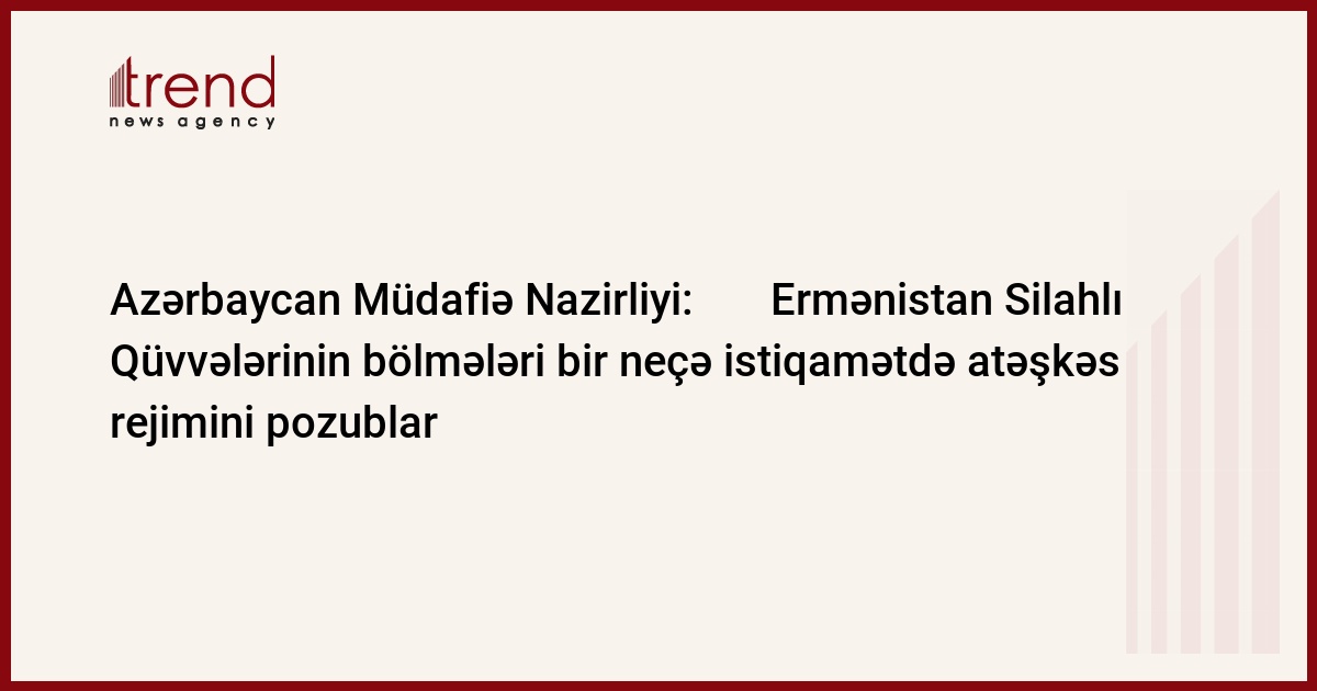 Azərbaycan, Bakı, 16 iyul/ Trend , müxbir E.Hüseynli/ Ermənistan Silahlı Qüvvələrinin bölmələri iyulun 15-də saat 13.50-dən 13.52-dək və saat 22.05-dən 22.25-dək Xocavənd rayonunun Kuropatkino kəndi yaxınlığında yerləşən mövqelərdən, iyulun 16-da saat 07.00-dan 07.20-dək Goranboy rayonunun Tapqaraqoyunlu kəndi yaxınlığında yerləşən mövqelərdən Azərbaycan Silahlı Qüvvələrinin üzbəüz mövqelərini avtomat və pulemyotlardan atəşə tutublar.