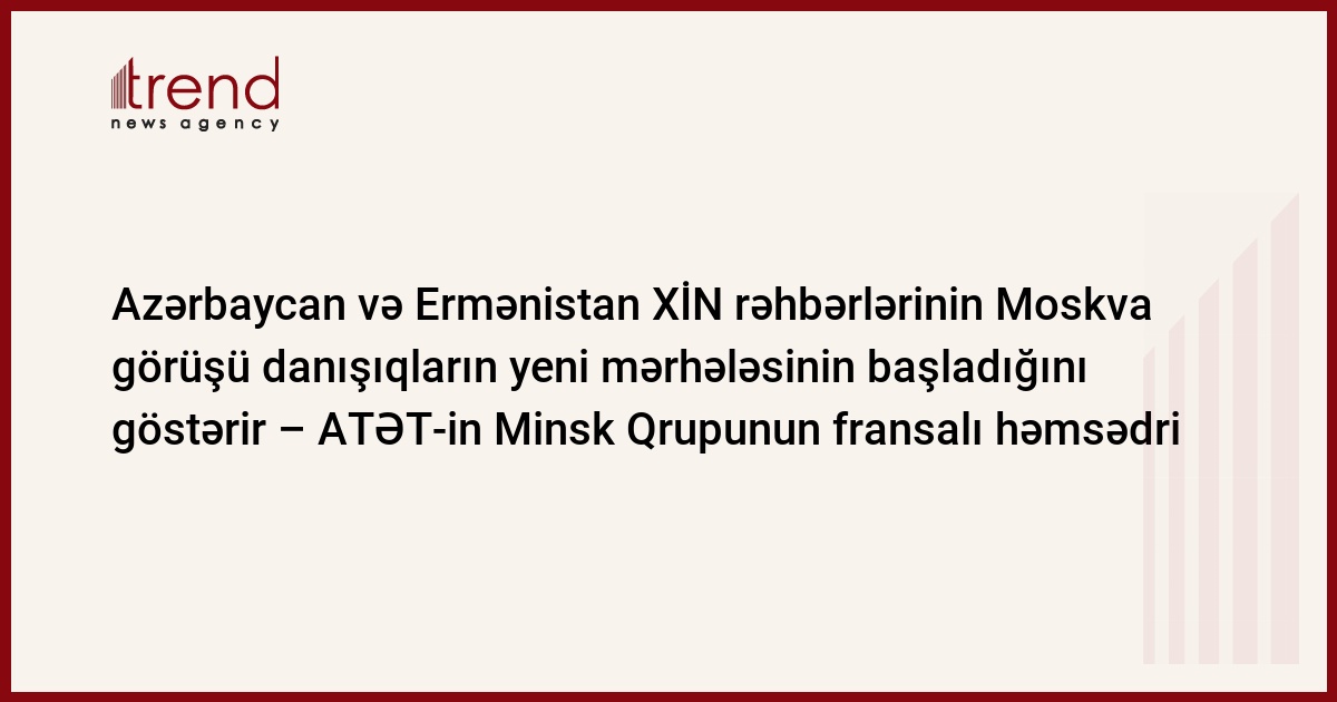 "Azərbaycan və Ermənistan XİN rəhbərlərinin qarşıdakı Moskva danışıqları iki ölkə prezidentlərinin Sankt-Peterburqda görüşdə təklif etdikləri yeni işin başlanğıcıdır", - ATƏT-in Minsk Qrupunun Fransadan olan həmsədri Bernard Fasye Trend -a bildirib.