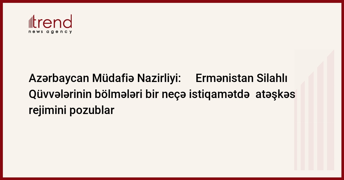 Azərbaycan, Bakı, 28 iyul/ Trend , müxbir C.Babayeva/ Ermənistan Silahlı Qüvvələrinin bölmələri iyulun 27-də saat 23.25-dən 23.30-dək və iyulun 28-də saat 03.10-dan 03.20-dək Ermənistan Respublikası İcevan rayonu Berkaber, Noyemberyan rayonu Voskepar kəndləri ərazisindəki mövqelərdən Azərbaycan Silahlı Qüvvələrinin Qazax rayonunun ərazisindəki adsız yüksəkliklərdə və Aşağı Əskipara kəndi ərazisində yerləşən mövqelərini, saat 22.10-dan 22.20-dək və iyulun 28-də saat 03.10-dan 03.20-dək Qazax rayonunun ərazisindəki adsız yüksəkliklərdə və Bağanis Ayrım kəndi yaxınlığında yerləşən mövqelərdən, saat 23.30-dan 00.45-dək və 05.45-dən 06.05-dək ara-sıra Xocavənd rayonunun ərazisindəki adsız yüksəkliklərdə və Kuropatkino kəndində yerləşən mövqelərdən, saat 22.00-dan 22.30-dək Tərtər rayonunun Seysulan kəndi yaxınlığında yerləşən mövqelərdən, saat 23.45-dən 00.25-dək fasilələrlə Füzuli rayonunun ərazisindəki adsız yüksəkliklərdə və Aşağı Veysəlli kəndi yaxınlığında yerləşən mövqelərdən Azərbaycan Silahlı Qüvvələrinin üzbəüz mövqelərini avtomat və pulemyotlardan atəşə tutublar.