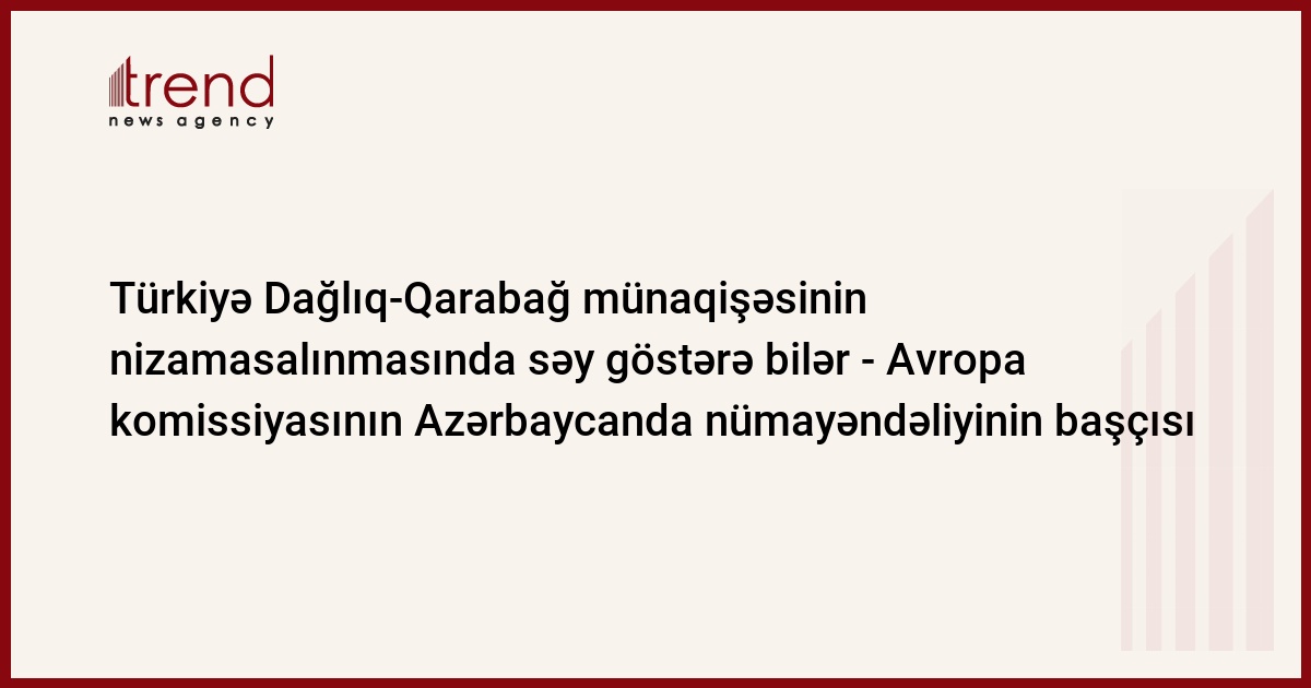 Azərbaycan, Bakı, 26 sentyabr/ Trend müxbir R.Novruzov/ Avropa Komisiyası hesab edir ki, Türkiyə Dağlıq-Qarabağ münaqişəsinin nizamasalınmasında səy göstərə bilər. "Türkiyənin "Qafqazda Təhlükəsizlik və Sülh Platforması" yaradılması təşəbbüsünü çox maraqlıdır və regionda münaqişələrin həllinə yardımçı ola bilər", cümə günü Trend a Avropa komissiyasının Azərbaycanda nümayəndəliyinin başçısı Alan Vaddams.