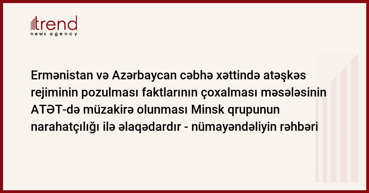 Azərbaycan, Bakı, 04 mart / Trend , müxbir E.Rüstəmov / "Ermənistan və Azərbaycan arasındakı cəbhə xəttində atəşkəs rejiminin pozulması faktlarının çoxalması məsələsinin ATƏT-in Daimi Şurasının müzakirəsinə çıxarılması, ATƏT-in Minsk qrupunun həmsədr ölkələri - ABŞ, Fransa və Rusiyanın narahatçılığından xəbər verir", - Azərbaycanın ATƏT yanındakı nümayəndəliyinin rəhbəri, ölkənin Avstriyadakı səfiri Fuad İsmayılov hesab edir.
