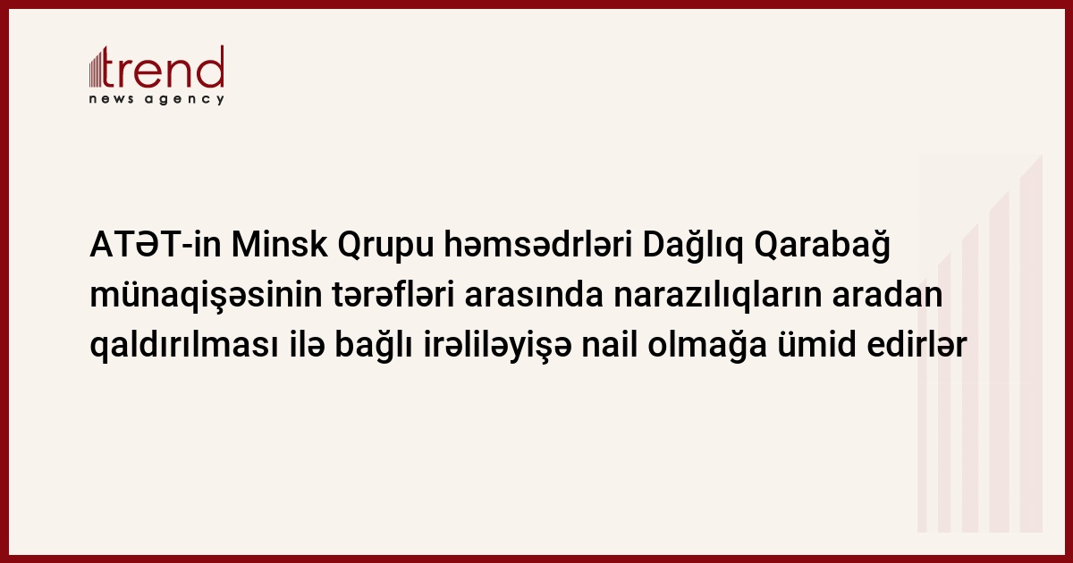 "ATƏT-in Minsk Qrupu həmsədrləri Dağlıq Qarabağ münaqişəsinin tərəfləri arasında narazılıqların aradan qaldırılması ilə bağlı irəliləyişə nail olmağa ümid edirlər", - ATƏT-in saytında yerləşdirilmiş vasitəçilər Yuri Merzlyakov (Rusiya), Bernar Fasye (Fransa) və Metyu Brayzanın (ABŞ) birgə bəyanatında deyilir.