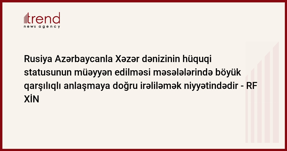 "Rusiya Azərbaycanla Xəzər dənizinin hüquqi statusunun müəyyən edilməsi, Xəzərdə çoxtərəfli təhlükəsizliyin təmin edilməsi mexanizminin yaradılması və Xəzərdə iqtisadi əməkdaşlığın təşkili məsələlərində böyük qarşılıqlı anlaşmaya tərəf irəliləmək niyyətindədir", - РИА Новости-yə müsahibəsində RF XİN rəsmi nümayəndəsi Andrey Nesterenko deyib.